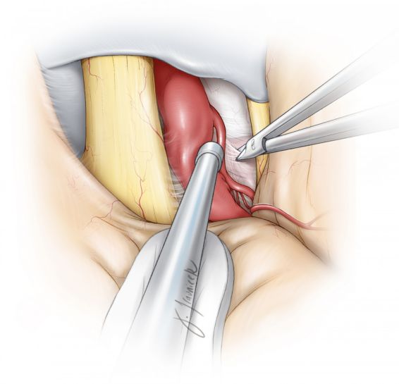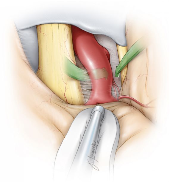 一旦显露后交通动脉与PCA的交界处,就能沿P1段向内侧显露基底动脉分叉部以及动脉瘤。动态牵拉ICA虽可引起其节段性狭窄,却容易耐受且无不良后果;但禁止用固定牵开器牵拉ICA。手术者必须认识到需通过放松对ICA的牵拉力来实现间断性再灌注。