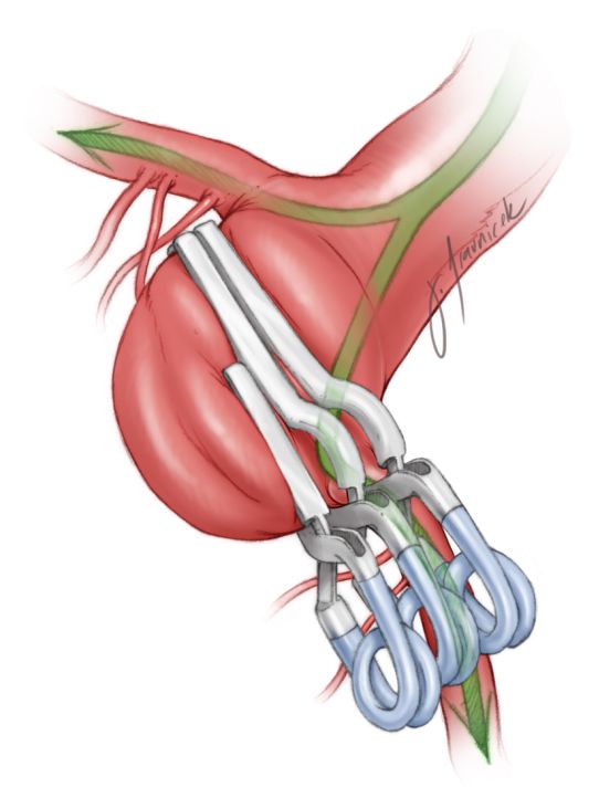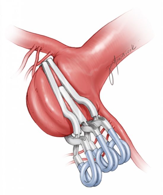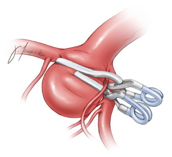 图16:以向下堆的串联方式夹闭基底动脉分叉部动脉瘤很有优势。开窗夹放置在动脉瘤远端,夹闭瘤颈远端的大部分。第二个简单型瘤夹放置在开窗夹近端,夹闭瘤颈的残余部分。夹闭瘤颈的同时,避开了流出动脉。