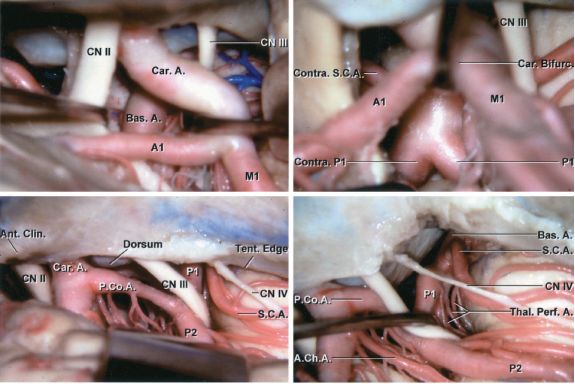 注:CN Ⅱ:视神经。Car.A.:颈内动脉。CN Ⅲ:动眼神经。Bas.A.:基底动脉。A1:大脑前动脉A1段。M1:大脑中动脉M1段。Contra.S.C.A.:对侧小脑上动脉。Contra.P1:对侧大脑后动脉P1段。Car.Bifurc.:颈内动脉分叉部。P1:大脑后动脉P1段。Ant.Clin.:前床突。P.Co.A.:和交通动脉。Dorsum:鞍背。P2:大脑后动脉P2段。Tent.Edge:天幕缘。CN Ⅳ:滑车神经。A.Ch.A.:脉络膜前动脉。Thal.Perf.A.:丘脑穿支动脉。