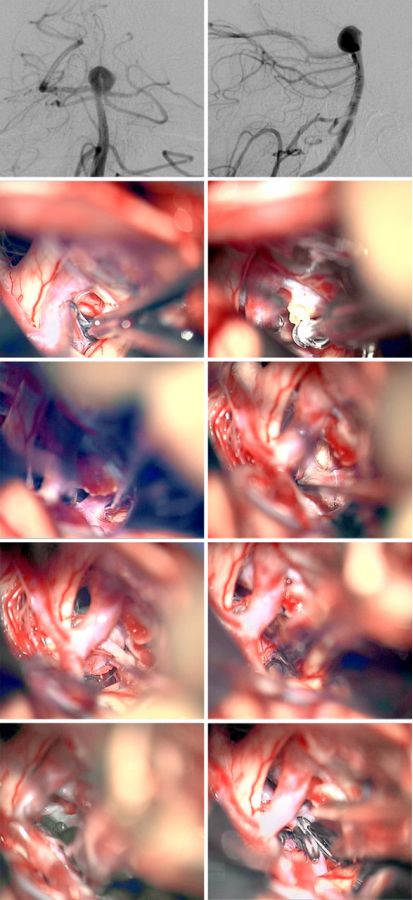 图19:展示以向上堆的串联方式夹闭一个基底动脉分叉部动脉瘤(第一排)。后床突已磨除(第二排)。控制近端血流,分离瘤颈远端的穿支(第三排)。辨认动脉瘤后壁的穿支,用一个直形开窗夹夹闭,同侧P1段与近端穿支血管置于开窗内(第四排)。第一个瘤夹没有误夹对侧P1段,另一个直形夹夹闭残余的近端瘤颈(最后一排)。