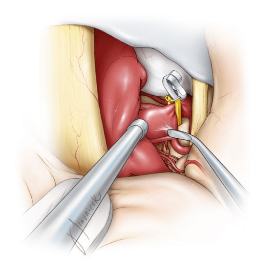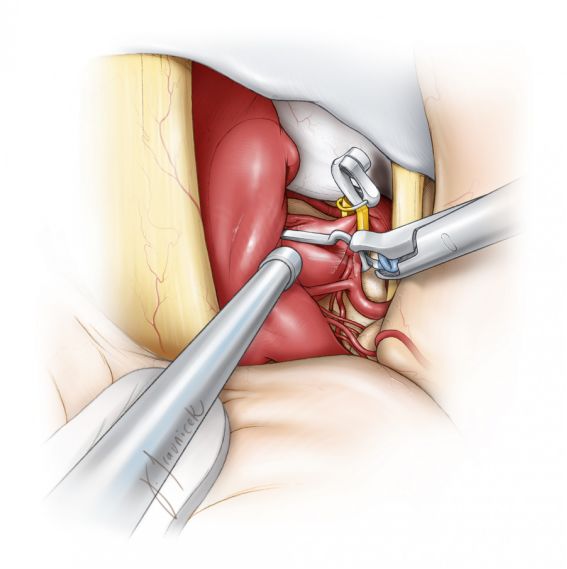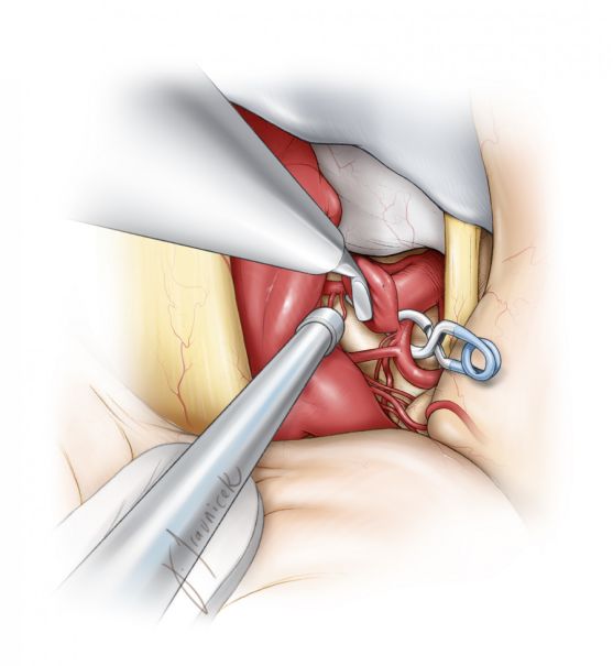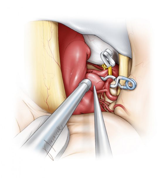 因分叉部过低而无法控制近端时,可磨除后床突来显露更近端的动脉。相关技术细节请参阅小脑上动脉动脉瘤 一章。