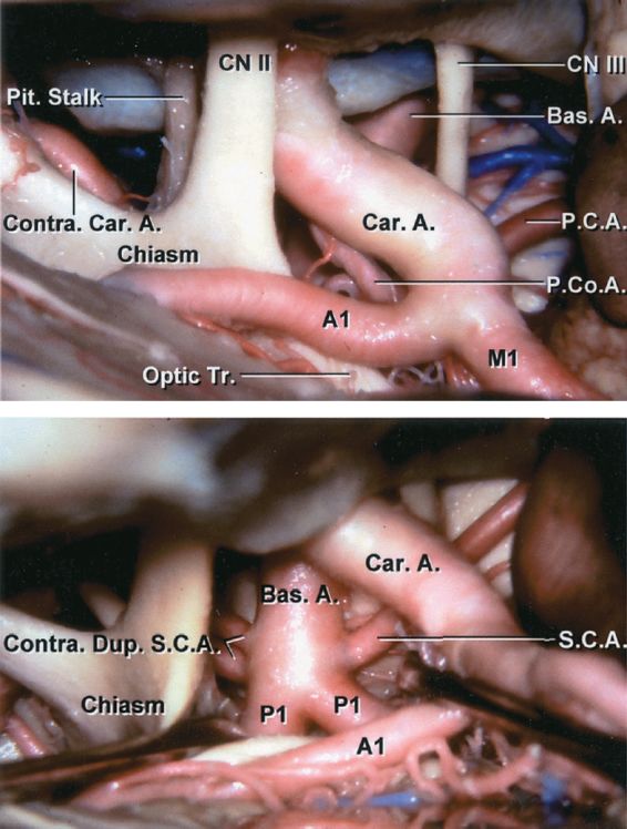 注:Contra.Dup.S.C.A.:对侧双支小脑上动脉。Chiasm:视交叉。Bas.A.:基底动脉。P1:大脑后动脉P1段。A1:大脑前动脉A1段。Car.A.:颈内动脉。S.C.A.:小脑上动脉。