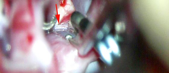 图14:瘤夹叶片的头端不应误夹对侧P1段的近端穿支(箭头)。这个基底动脉动脉瘤从右侧经侧裂入路进行手术。