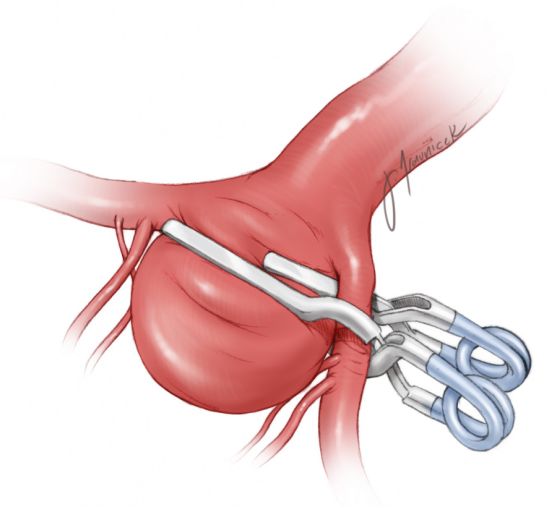 图11:一旦放置瘤夹,且探查无穿支血管误夹,则进行手术中荧光造影来确认没有血流进入瘤腔、附近分支与穿支动脉保留完好。当首次夹闭后瘤颈截面变成卵圆形时,手术者可发现瘤夹过短,可能需更换瘤夹。这是瘤腔持续充盈的最常见原因。如果瘤腔没有荧光显影,则用针穿刺瘤顶减压。
