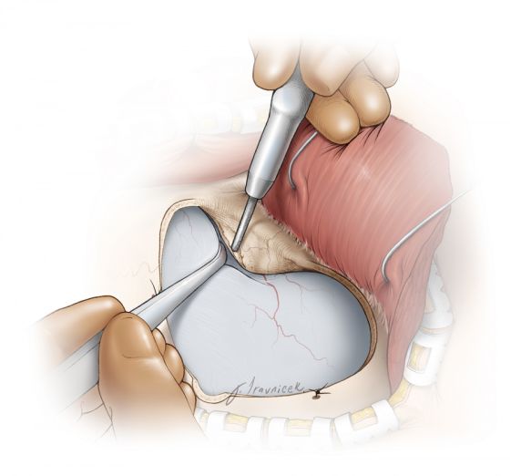 此时可显露覆盖蝶骨与侧裂岛盖段的硬脑膜。骨缘用骨蜡止血,防止经气化的内侧蝶骨嵴发生脑脊液漏(发生于10%的患者)。弧形切开硬脑膜。