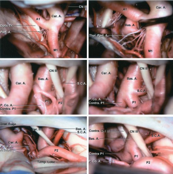 注:Optic.Tr.:视神经干。Perf.A.:穿支动脉。A1:大脑前动脉A1段。Car.A.:颈内动脉。M1:大脑中动脉M1段。CN Ⅲ:动眼神经。Bas.A.:基底动脉。Thal.Perf.A.:丘脑穿支动脉。S.C.A.:小脑上动脉。P1:大脑后动脉P1段。P2:大脑后动脉P2段。P.Co.A.:后交通动脉。Contra.P1:对侧大脑后动脉P1段。Tent.Edge:天幕缘。A.Ch.A.:脉络膜前动脉。Temp.Lobe:颞叶。Contra.CN Ⅲ:对侧动眼神经。