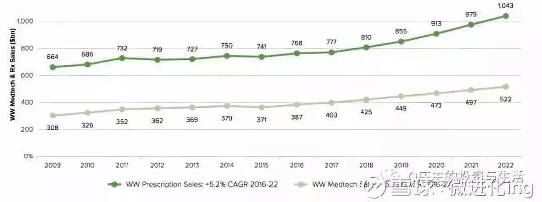 与药物市场相比,2017年全球处方药市场规模7770亿美金,到2022年,将达到1.043万亿美金,CAGR年化增长5.2%。2022年,器械市场约占到全球药物市场规模的一半,两个市场的增速相当。