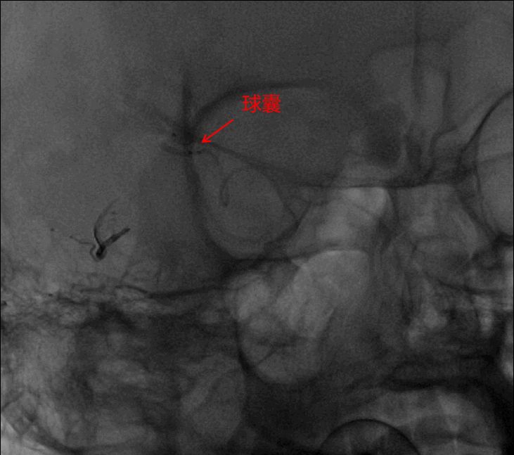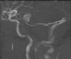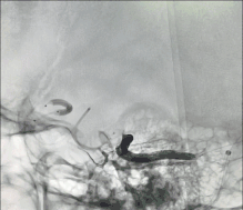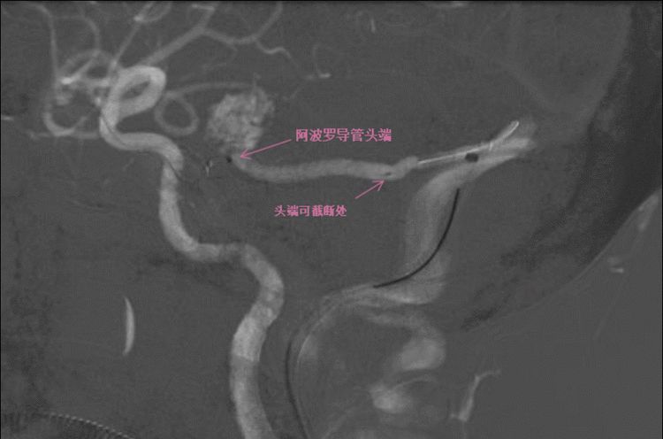 将Scepter C 4*15球囊经颈内动脉超选到大脑中动脉颞支(畸形团主要供血动脉),充盈球囊,阻断动脉端畸形团血流。