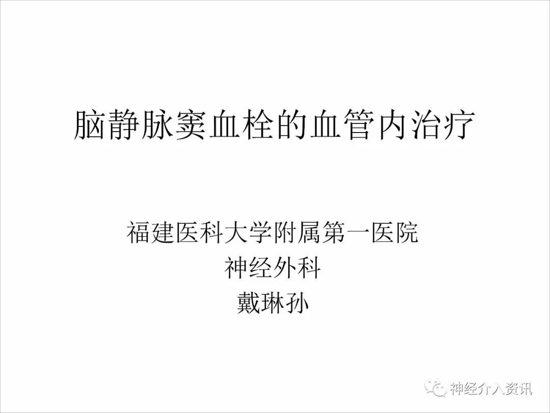 今天为大家分享的是由福建医科大学附属第一医院戴琳孙教授在第十二届华东地区脑血管病血管内治疗大会上带来的“脑静脉窦血栓的血管内治疗”精彩讲课视频和PPT,欢迎观看!(内容未经讲者审核,不当之处请与我们联系)