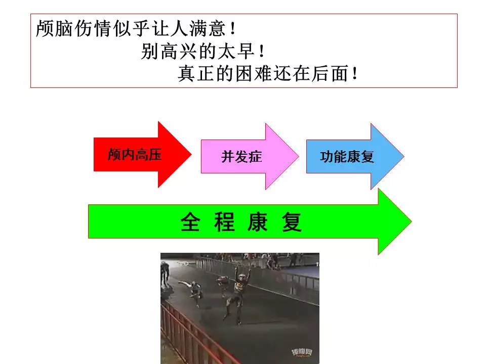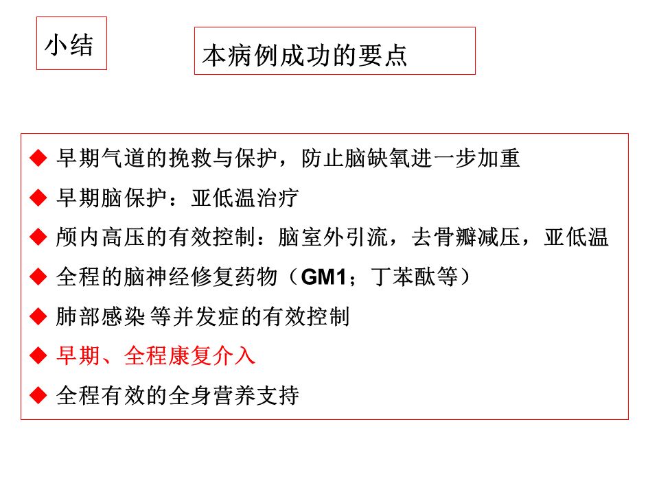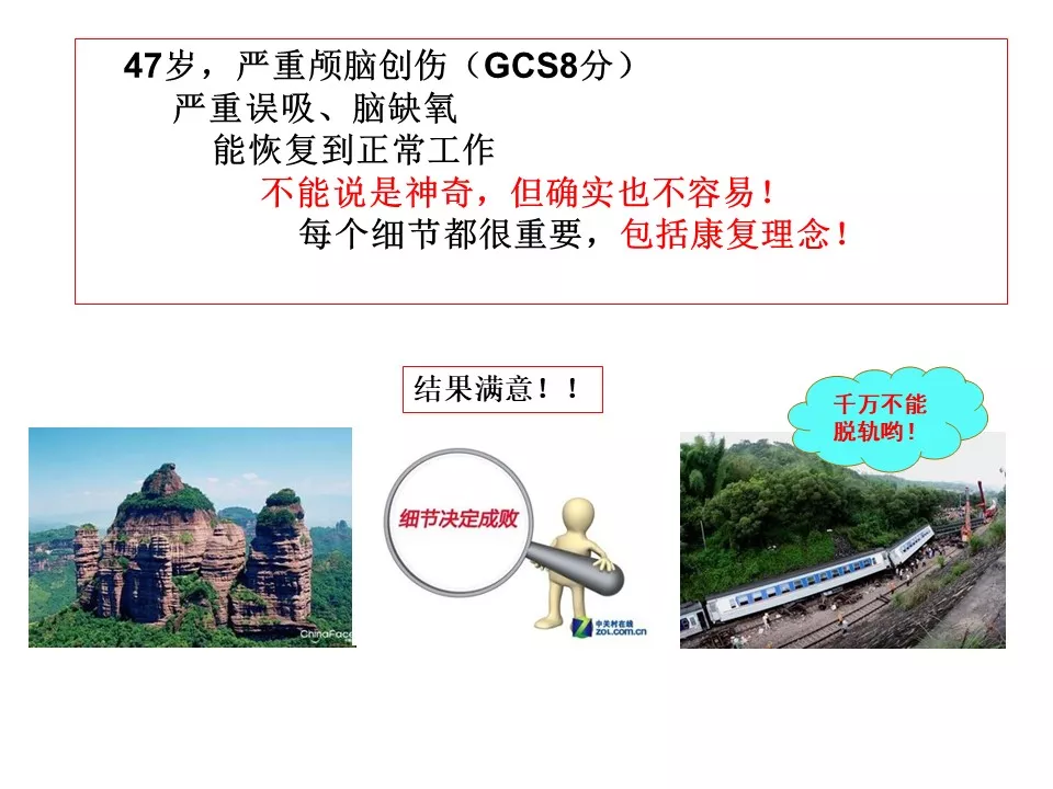 这例成功病例还有一个特点就是早期康复的介入。传统上我们经常认为康复应当是颅脑损伤患者在生命体征完全平稳后转入康复科或康复中心再开始,实际上神经修复的工作应当在条件允许的情况下越早介入越好。对于这个病例,还有个建议,这例患者是在伤后16天出现严重的肺部感染合并ARDS。当然,意识障碍患者的肺部感染非常常见,但是进展到ARDS可能和前期管理有一定关系,或者说也许可以做的更好。实际上对于这类并发症预防重于治疗,比如避免误吸、积极地痰液引流、早期气管切开等等,当然在这例患者在这方面的资料提供的较少,也许龙连圣主任团队已经在这些方面都做到了。