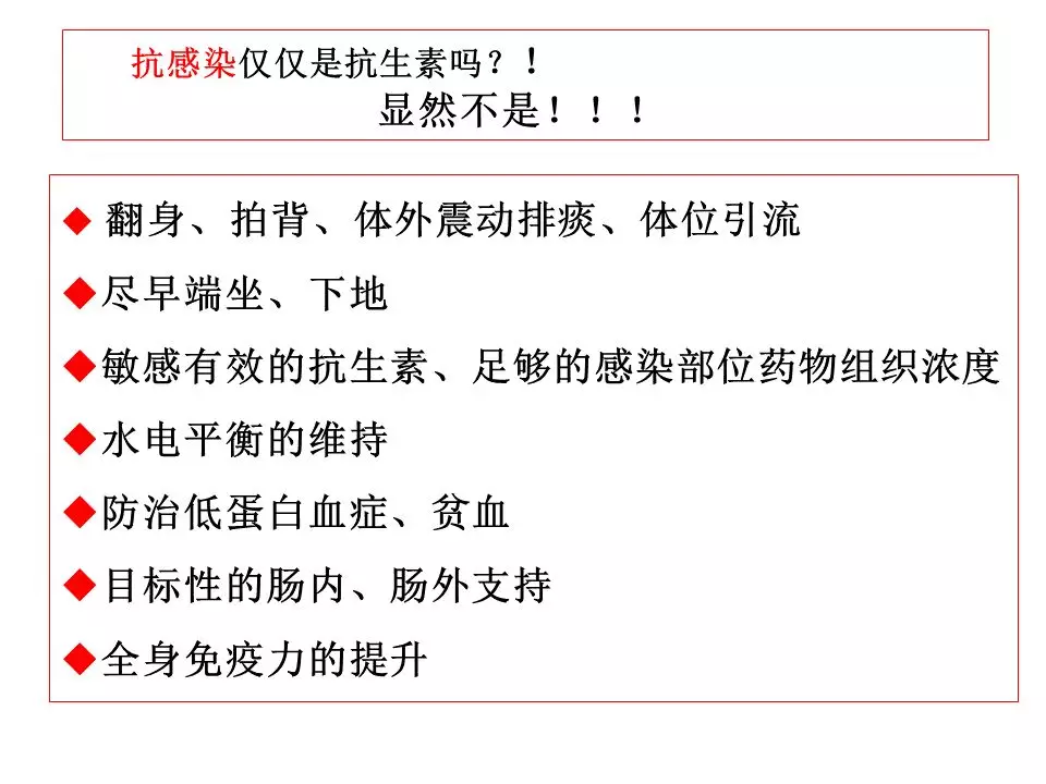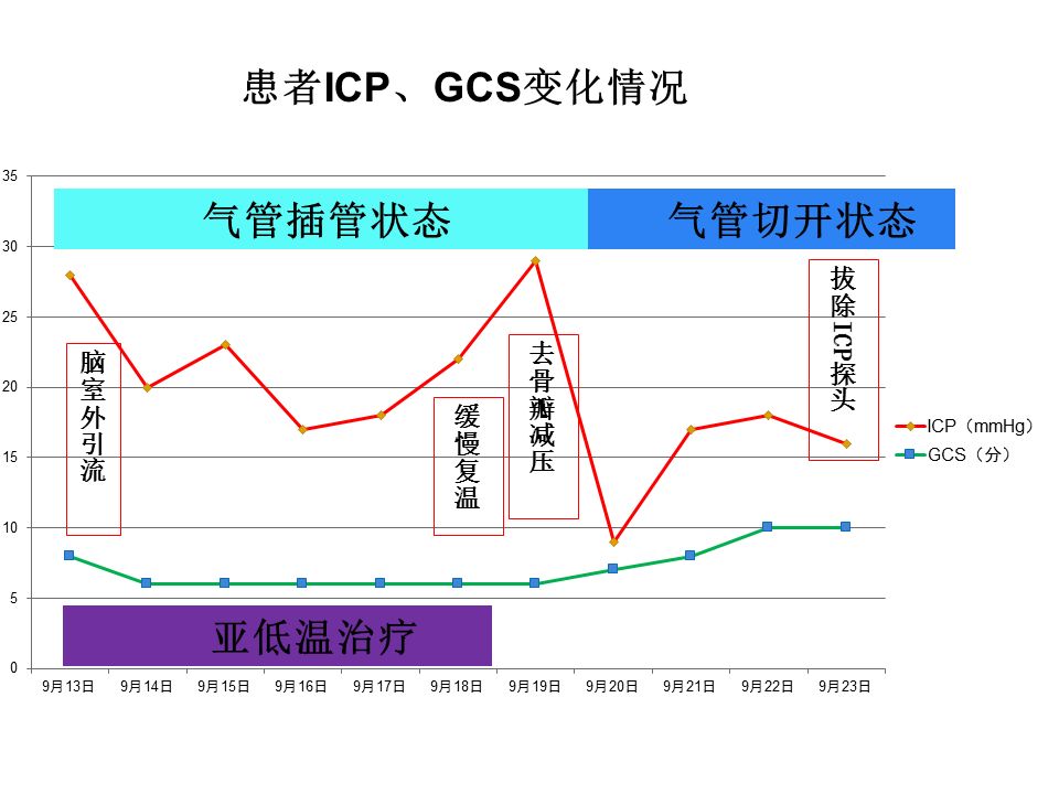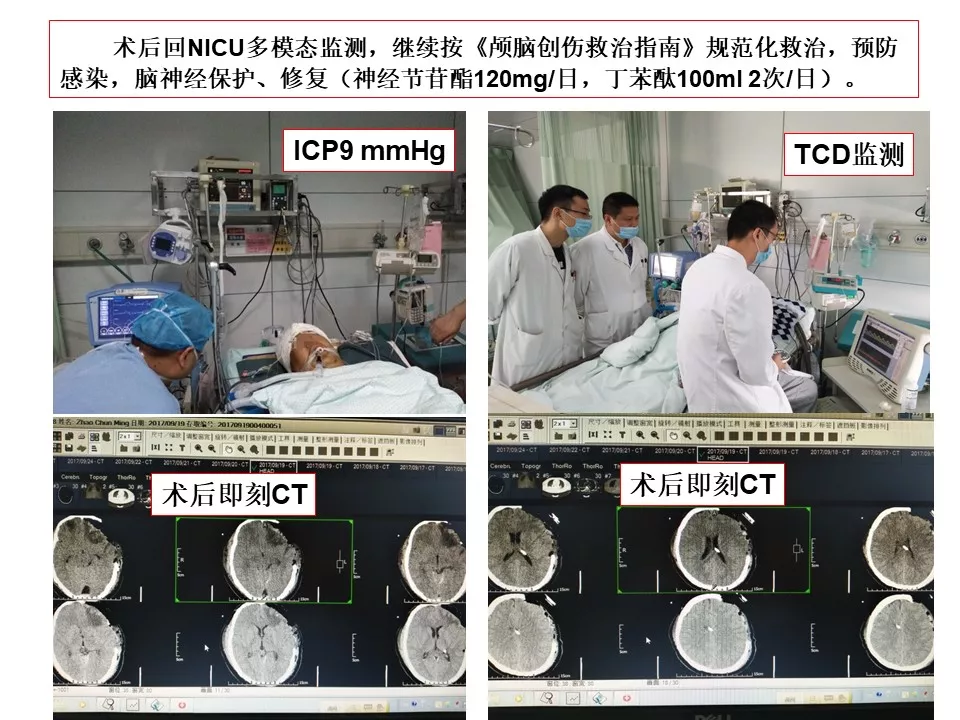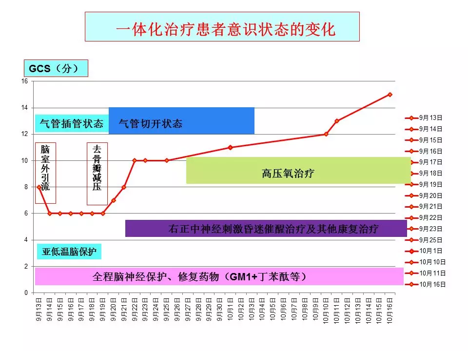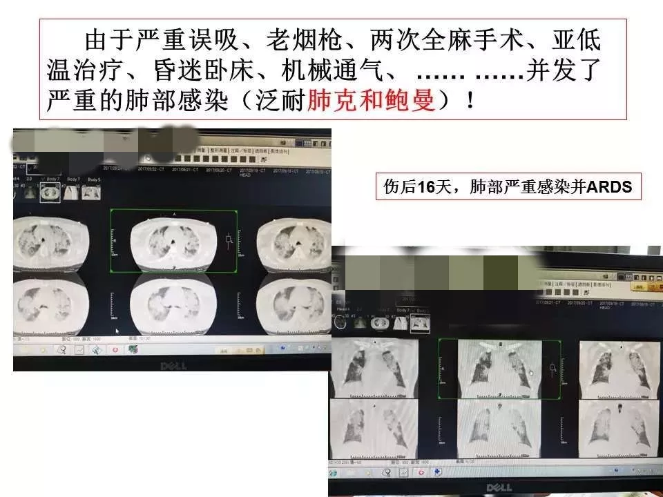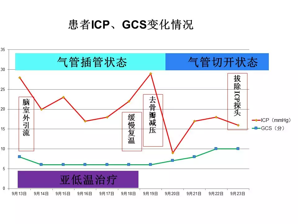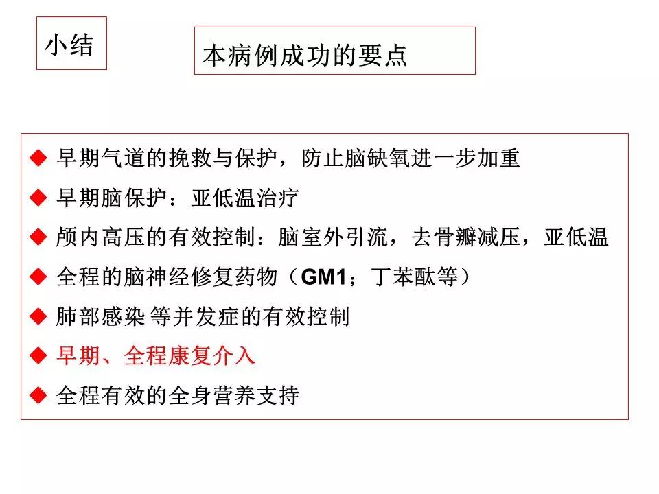 从这例成功的病例中,早期以维持脑灌注管理为核心,通过颅内压监测对ICP实施阶梯、精准地管理,从CSF引流、亚低温到去骨瓣减压最终使得患者度过了高颅压阶段。这个过程中又出现了严重的肺部感染,当然这只是重型颅脑损伤患者最常见的并发症之一,这样的患者同样容易出现深静脉血栓、消化道出血、营养失衡等等情况,这就需要神经重症团队的精细化管理,尽早预判、预防,一旦出现也要及早干预。