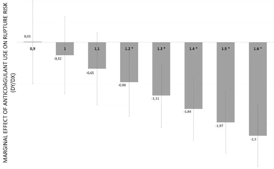 研究发现:对于抗凝剂使用者,抗凝治疗对破裂风险的边际效应是负影响。当INR值≥1.2时,服用华法林能够减少INR值对破裂风险的影响。