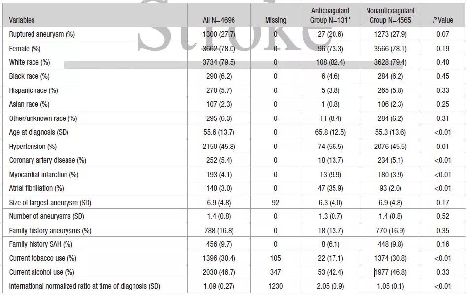 该研究纳入4696名颅内动脉瘤患者(共发现6403个动脉瘤),其中包括1198名前瞻患者,这些患者于1990年至2016年期间在麻省总医院和布莱根妇女医院诊断为颅内动脉瘤,入组者或使用华法林抗凝,或未进行抗凝治疗。患者分为破裂组和未破裂组。采用单变量和多变量Logistic回归分析来评估抗凝治疗、INR值与颅内动脉瘤破裂的关系,同时评估抗凝剂使用与INR之间的相互关系。