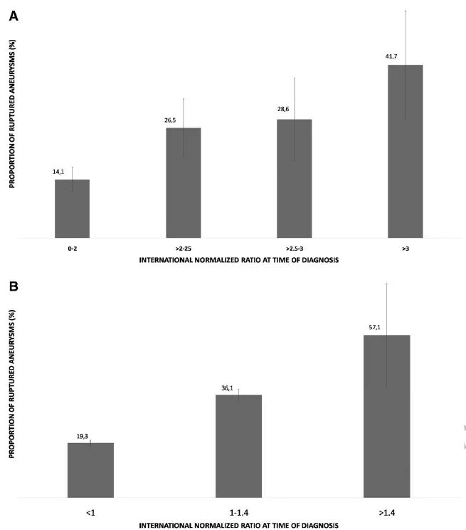 图2显示根据使用抗凝剂和未使用抗凝剂患者的INR值分层的破裂动脉瘤比例。无论患者是否接受抗凝治疗,INR值水平较高,破裂动脉瘤破裂比例越高。但在接受抗凝治疗的患者中,当INR值>3时,破裂动脉瘤占41.7%,而在未接受抗凝治疗的患者(如肝脏疾病、出血性疾病或维生素K缺乏)中,当INR值>1.4,时,破裂动脉瘤即占据57.1%。