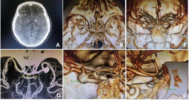 图1入院后急诊行头部CTA检查结果提示颅内多发动脉瘤(A)当地医院头颅CT提示右侧侧裂池蛛网膜下腔出血;(B)头颅CTA检查提示左侧中动脉分叉部动脉瘤,瘤颈宽;(C)头颅CTA提示右侧大脑中动脉M1段动脉瘤,为责任动脉瘤,瘤体朝向蝶骨嵴(D)右侧瘤颈距离中动脉起始部长达24mm (E)左侧大脑中动脉分叉部宽颈动脉瘤,约8.7×8.0mm(F)右侧大脑中动脉M1段动脉瘤,约3.6×3.2mm