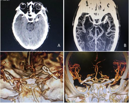 图3:患者术后术后复查头颅CT术区未见出血或梗塞灶。CTA提示双侧动脉瘤瘤颈均完全夹闭,未见残留。载瘤动脉及各分支血管均通畅。