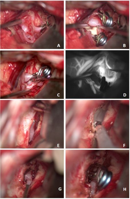 图2 患者手术中动脉瘤夹闭及分支血管保留情况。(A)探查并分离瘤颈周围黏连后充分显露瘤颈,因瘤体张力大,予临时阻断M1段;(B)临时阻断M1段,瘤体张力降低不明显,再临时阻断上干及下干后分离瘤颈 ;(C)蛇牌760及722动脉瘤夹各一枚完全夹闭动脉瘤;(D)荧光造影确认瘤腔内无荧光显影,各分支血管显影满意,并剪开瘤体验证瘤颈完全夹闭。(E)额下分离,牵开眶回内侧部,充分解剖对侧外侧裂后显露M1段,长约24mm;(F)瘤颈被蝶骨嵴遮挡无法显露,使用超声骨刀磨除部分蝶骨嵴;(G)磨除蝶骨嵴后显露动脉瘤瘤颈,约4mm;(H)使用一枚蛇牌740动脉瘤夹成功夹闭对侧M1段动脉瘤。