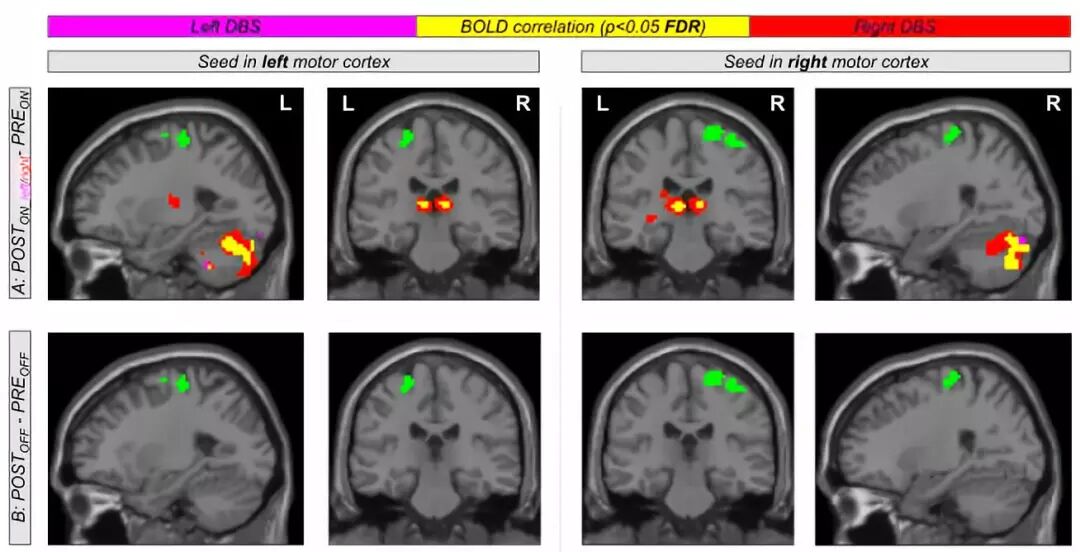 图2. MRI-EC成像显示左旋多巴与STN-DBS对运动网络连接功能的影响。上排:DBS治疗与左旋多巴治疗时的MRI-EC成像表现;下排:DBS未电刺激与停用左旋多巴时的MRI-EC成像表现。