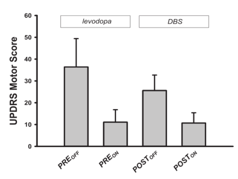 该研究纳入13例患有严重运动障碍的PD患者。采用帕金森病运动功能评分量表(UPDRS)评估DBS电极植入前使用左旋多巴(PREON)和停用左旋多巴(PREOFF)时的临床功能状况以及DBS电极植入后采用DBS刺激(POSTON)和停用DBS刺激(POSTOFF)的临床功能状况。结果显示,两种治疗方法后的帕金森病运动功能评分量表的评分均较治疗前明显下降,但治疗后两组的UPDRS评分评估的最终临床症状无明显差异(p>0.8)。以停用左旋多巴(PREOFF)UPDRS评分为症状基线,单纯DBS植入而不给予电刺激(POSTOFF)时的UPDRS评分无降低(p>0.8),提示DBS的电刺激发挥缓解症状的作用(图1)。
