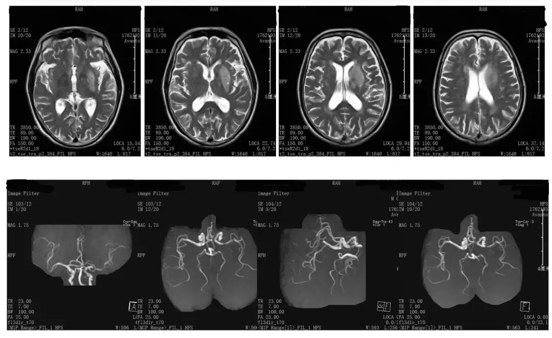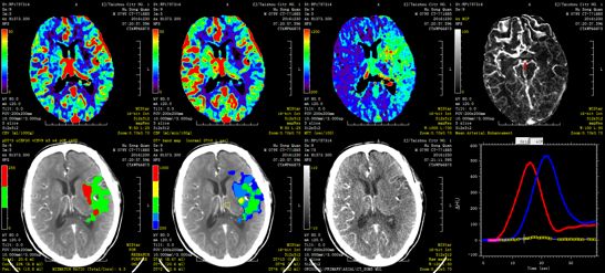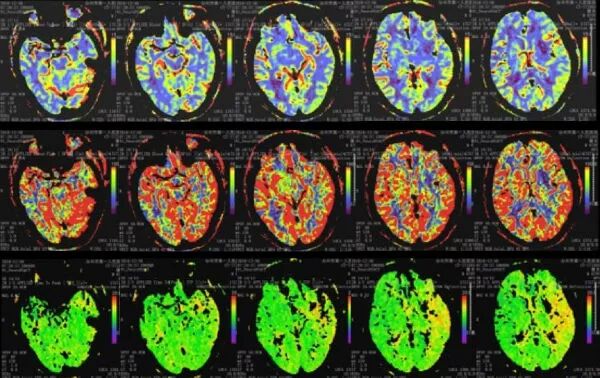 CT平扫未见早期梗死表现;CT灌注成像示:左侧半球MTT延长,CBF见内囊有部分核心坏死,CBV下降不显著。