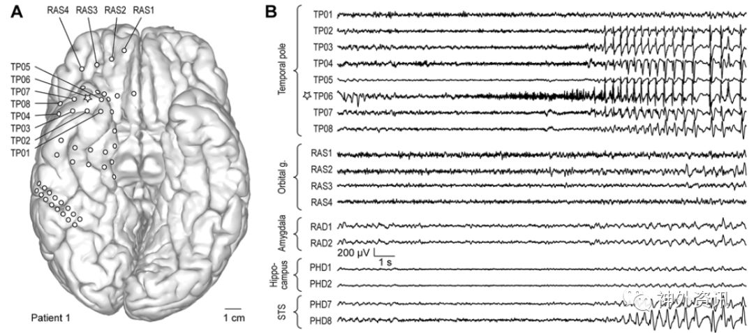 图2. A.大脑腹侧面解剖图显示,术野部位植入的皮质电极阵列。五角星表示癫痫发作部位(TP06)。B.植入TP和眶回皮质以及杏仁核、海马和颞上沟(STS)深部电极记录的脑电图。s=秒。
