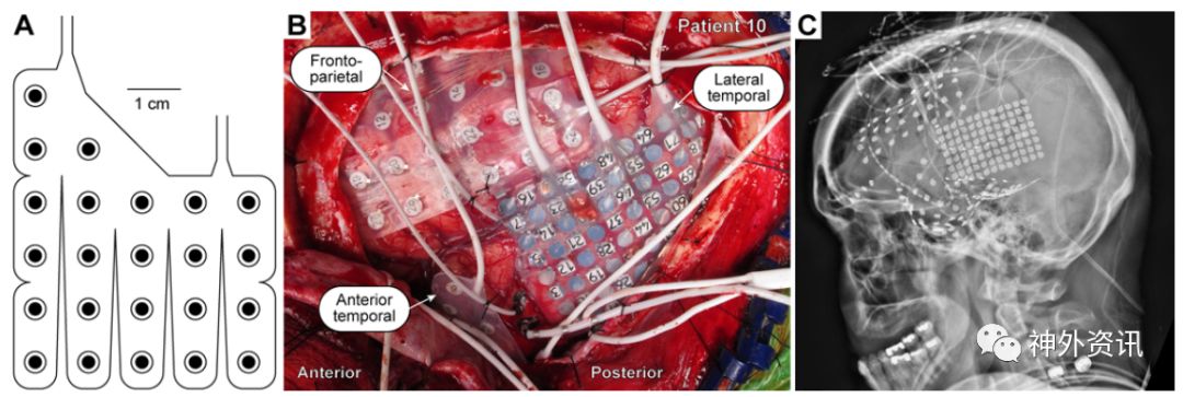 图1. 前颞叶(ATL)术中电极放置位置。A.23导ATL电极阵列示意图;B.术中照片表示阵列的放置,包括ATL阵列;C.植入ATL阵列患者的X线片。