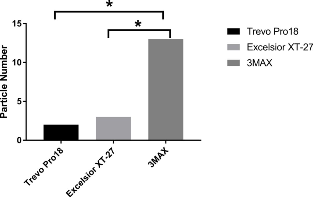 9次试验后,Pro18、XT-27和3MAX三种尺寸微导管导致的微栓子总长度分别为0.6±0.68mm、0.8±0.91mm、2.4±1.52mm,Pro18和XT-27所产生的大于1000μm的微栓子总数显著少于3MAX(P=0.104);尺寸在200-500μm范围之间的微栓子个数三组之间无显著差异;尺寸在8-200μm的微栓子总数Pro18组略小于XT-27(-18%),三组之间无显著差异。