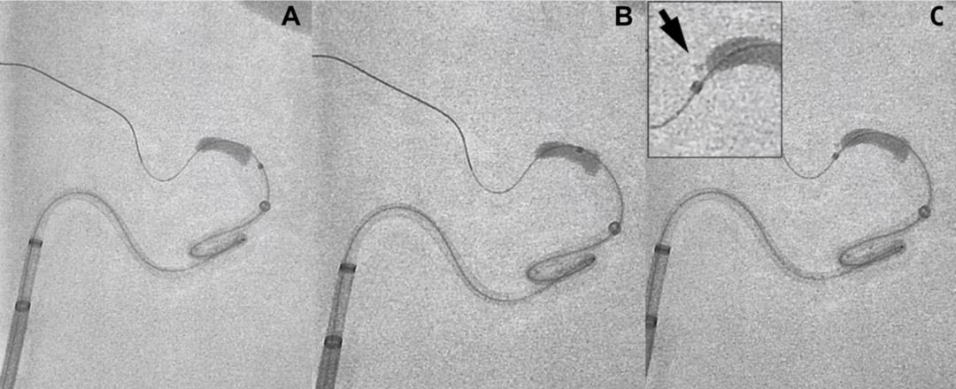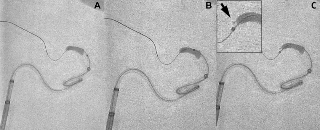 图1:微导管穿越血栓,随后撤出导丝,使用300ml盐水缓慢冲洗微导管收集血栓残片(箭头)