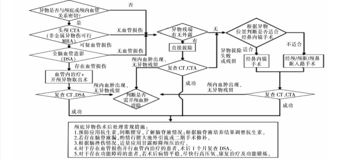 所有患者于术后均应尽早复查头颅CT,除外有无颅内血肿和异物残留。若有异物残留,应根据异物的性质及残留部位评估是否需行二次手术清除。若存在颅内血肿,应根据血肿量及部位,评估是否需行血肿清除手术。对于异物与血管关系密切和(或)行直接异物拔除者,应复查头颅CTA;行血管内治疗者应于术后即刻以及术后1个月复查全脑DSA。