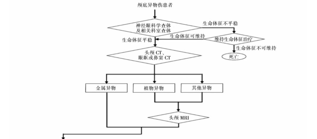颅底异物伤患者的外伤史通常较明确,根据异物性质、穿通部位的不同,需采用不同的治疗策略,但应首先关注患者的生命体征。若患者的生命体征不稳定,应积极维持生命体征,待生命体征平稳后,进一步推进相关诊疗进程。