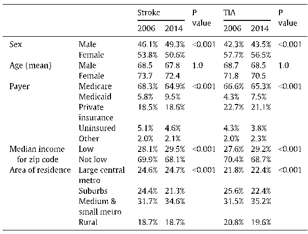 从2006年至2014年的9年期间,有390万例脑卒中和250万例TIA患者到急诊部门就诊或住院治疗。脑中风和TIA患者平均年龄没有显著变化(表1)。