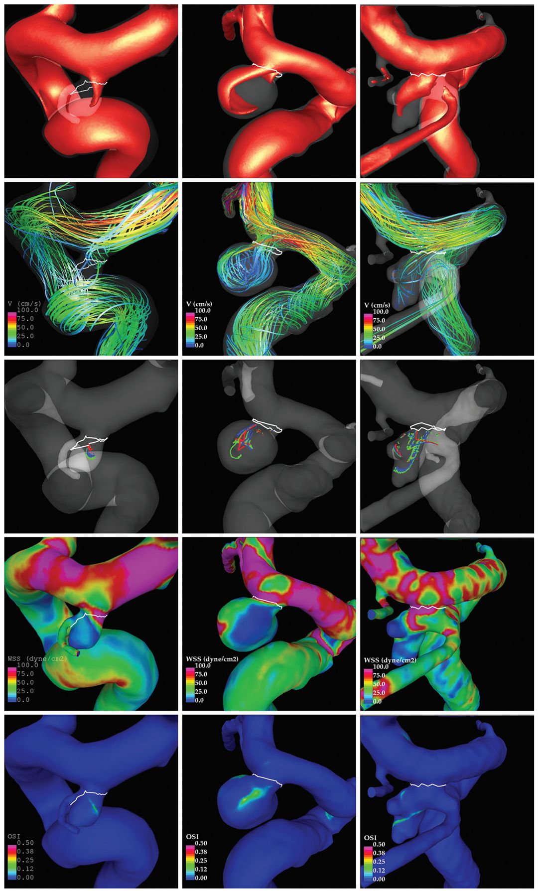 图4. 稳定的(左)、不稳定的(中)和破裂的(右)动脉瘤在同一单个位置的例子(后交通动脉)。可视化显示为从上到下:血流入射图、血流型态,心脏循环4个瞬间的涡核线,血管壁剪切应力和振荡剪切指数。