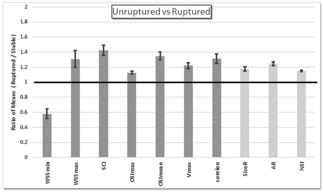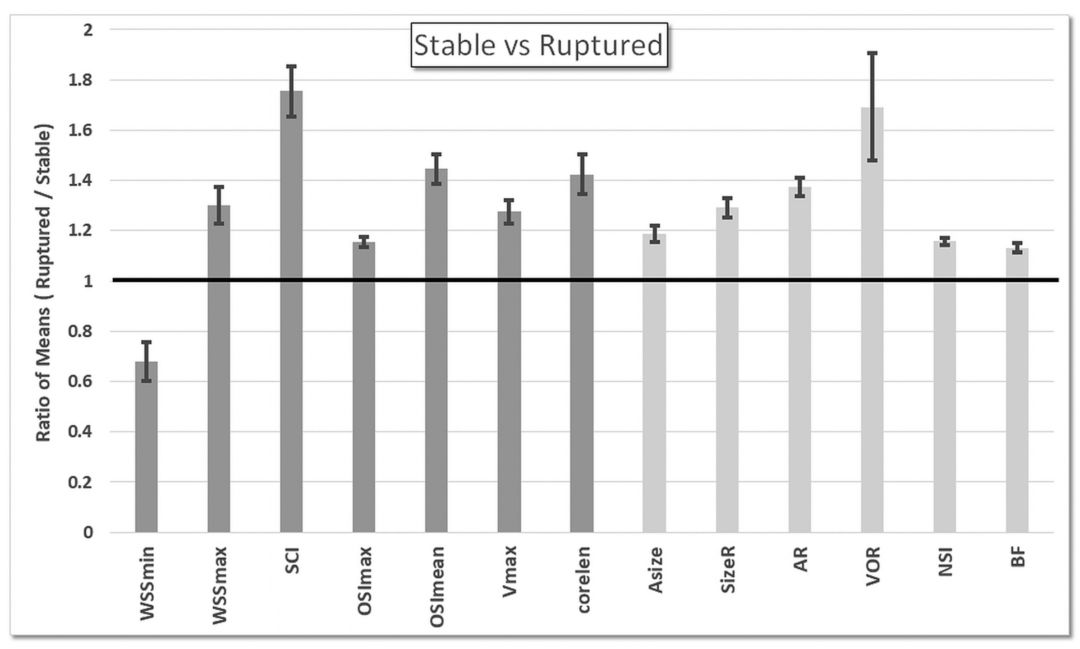 图1. 破裂动脉瘤组平均值与稳定动脉瘤组平均值比较。只有以上血流动力学(深灰色)和几何变量(浅灰色)在这两组之间有显著差异(在多次检测校正前P<0.05)。