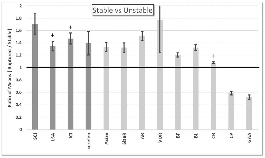 图2. 不稳定动脉瘤组平均值与稳定动脉瘤组平均值比较。以上血流动力学(深灰色)和几何变量(浅灰色)存在显著差异(在多次检测校正前P<0.05)或轻微显著(在多次检测校正前P<0.1;标记为加号)。ICI为血流集中指数;BF为瓶颈因素;CR为凸性比率。