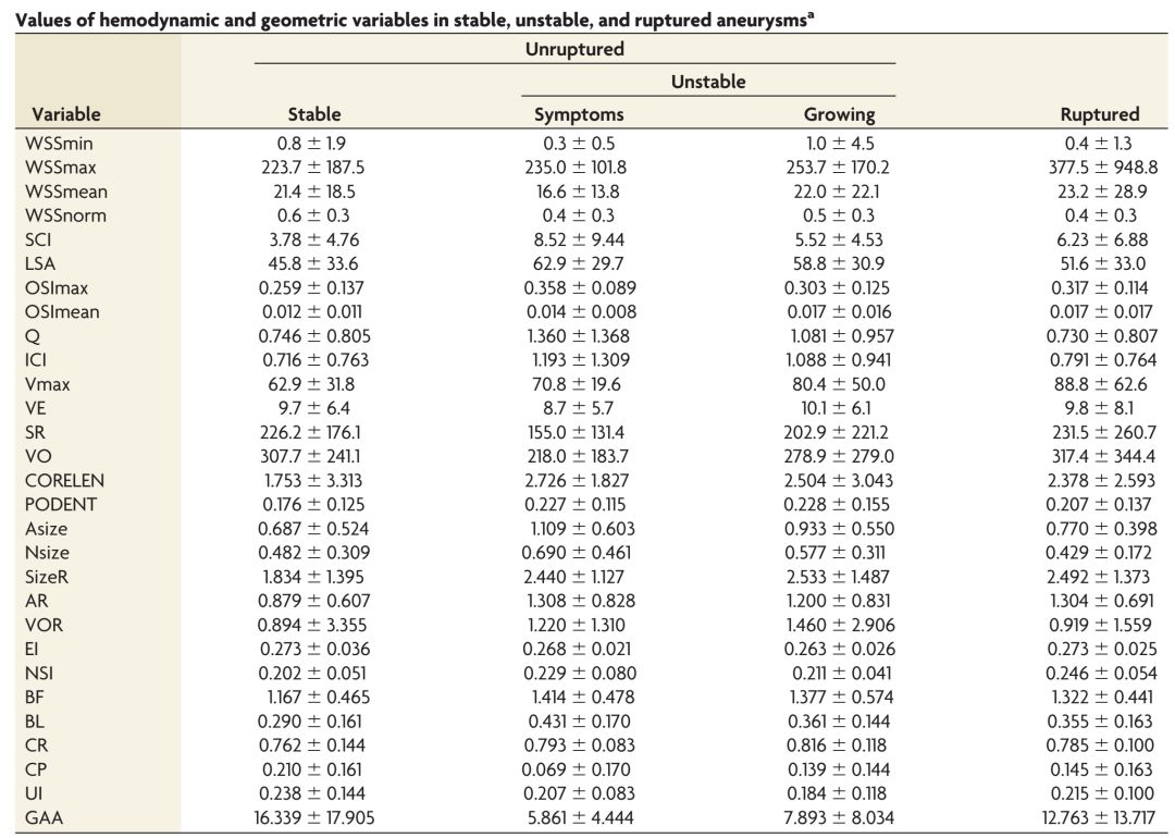 研究共比较了165例稳定动脉瘤、65例不稳定动脉瘤以及554例破裂动脉瘤患者的血流动力学和几何结构。采用基于图像基础的流体动力学计算方法对血流动力学进行建模。病例对照选择控制的变量为动脉瘤位置、患者年龄和性别。采用两两Wilcoxon检验比较不同动脉瘤组的血流动力学和几何变量的统计方法。重复配对100次,计算并调整组合P值进行多次测试后获得最终结果。