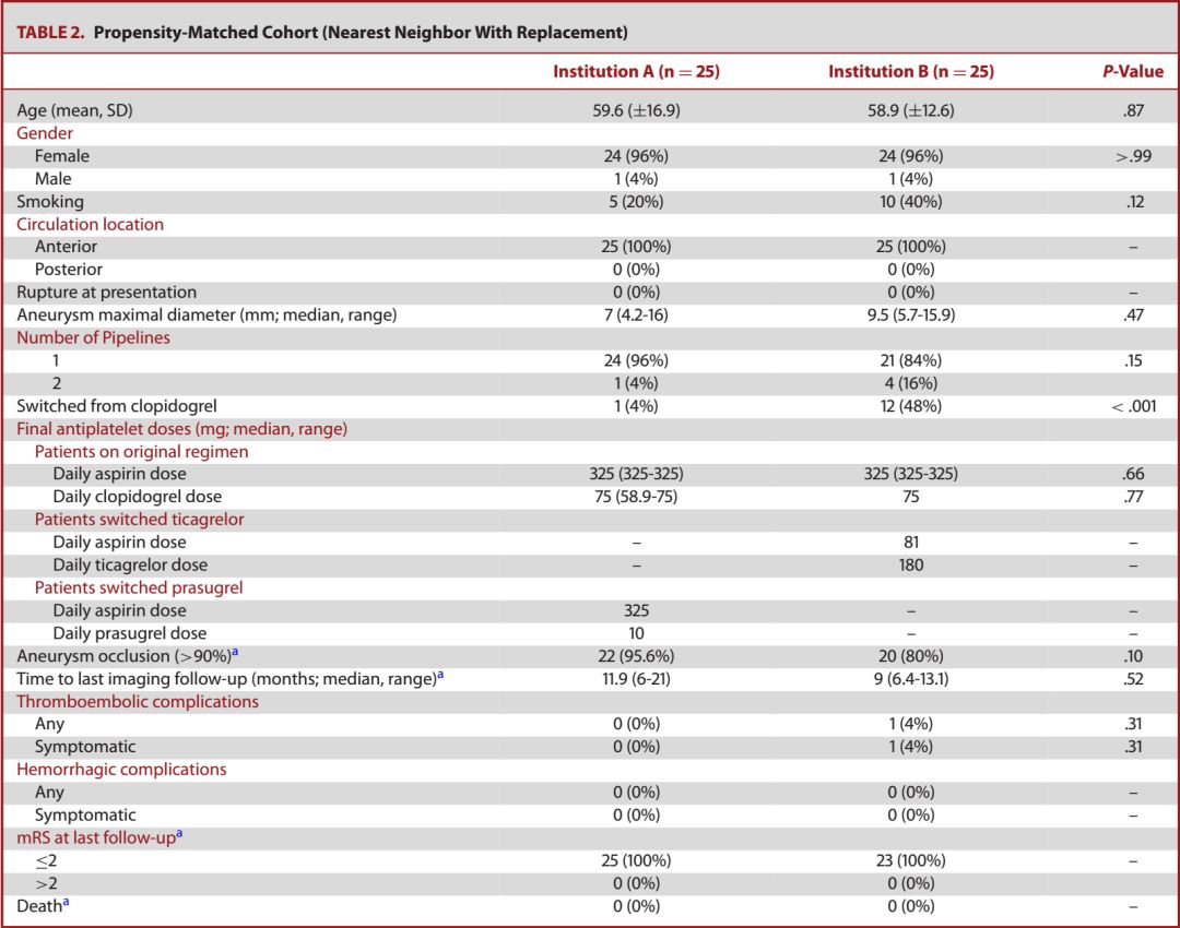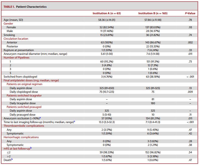 该研究回顾性分析了美国2个医学中心在2014-2017年间行PED治疗的颅内动脉瘤患者的临床资料。一线抗血小板药物包括阿司匹林和氯吡格雷。其中A医学中心使用VerifyNow检测系统对血小板功能进行重复检测后再进行抗血小板药物的调整;而B医学中心使用光学比浊法在PED治疗术前对血小板功能进行检测来决定是否更换抗血小板药物。