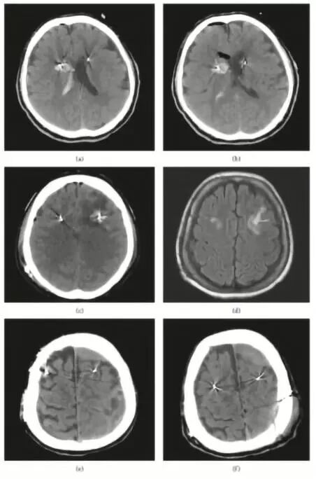 图1. DBS术后CT扫描显示并发症。a、b.右侧尾状核血肿伴右侧脑室内出血;c.左额电极周围静脉性梗死灶;d.6个月后CT复查,病灶消失;e.左侧额、顶叶慢性硬膜下血肿;f.为避免电极移位,清除左顶血肿后,左额血肿未处理。