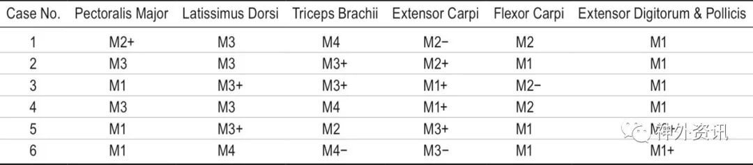 该研究分两部分,解剖研究:对5具经防腐处理的成年尸体双侧C7神经根进行解剖,追踪其远端分支直至支配肌群;临床研究:对6例行CC7移位至患侧中干的TBPP患者进行临床观测,采用改良医学研究委员会量表(Medical Research Council scale)和肌电图检查等评估预后。解剖研究结果显示,在胸外侧神经、胸背神经和桡神经中,均存在来源于C7的神经纤维。来源C7的神经纤维在胸长神经中所占比例极小。C7神经根距胸外侧神经的胸大肌入口最短,平均10.3±1.4厘米。纳入临床研究的患者在术后平均随访30.8±5.3个月;6例患者中,5例肩关节内收和肘关节伸直肌力恢复至3级或3级以上。2例患者伸腕肌力恢复至3级。6例患者伸腕伸指活动部分恢复,但肌力较差。复合肌肉动作电位在胸大肌上记录至平均6.7±0.8个月、背阔肌9.3±1.4个月、肱三头肌11.5±1.4个月、伸腕肌17.2±1.5个月、桡侧屈腕肌17.0±1.1个月和指伸肌22.8±2.0个月。示指早期感觉恢复至2度(表1、2)。所有患者均出现健侧手部一过性感觉异常,术后6个月内消失。
