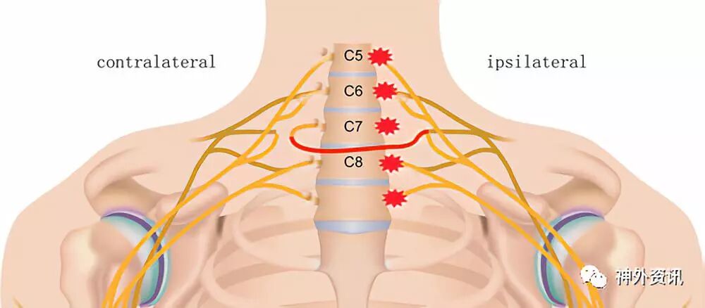1992年顾玉东院士首次报告,健侧颈7神经根(contralateral C7,CC7)移位(图1)修复全臂丛神经瘫痪(total brachial plexus palsy,TBPP)获得良好的疗效。以后,这个手术方式得到广泛应用。同时,CC7移位术的适应证也逐步扩展到治疗中枢神经系统疾病,如脑瘫、颅脑外伤及脑卒中。