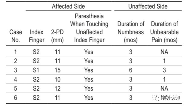 表2. 6例TBPP患者患侧肢体感觉恢复情况。