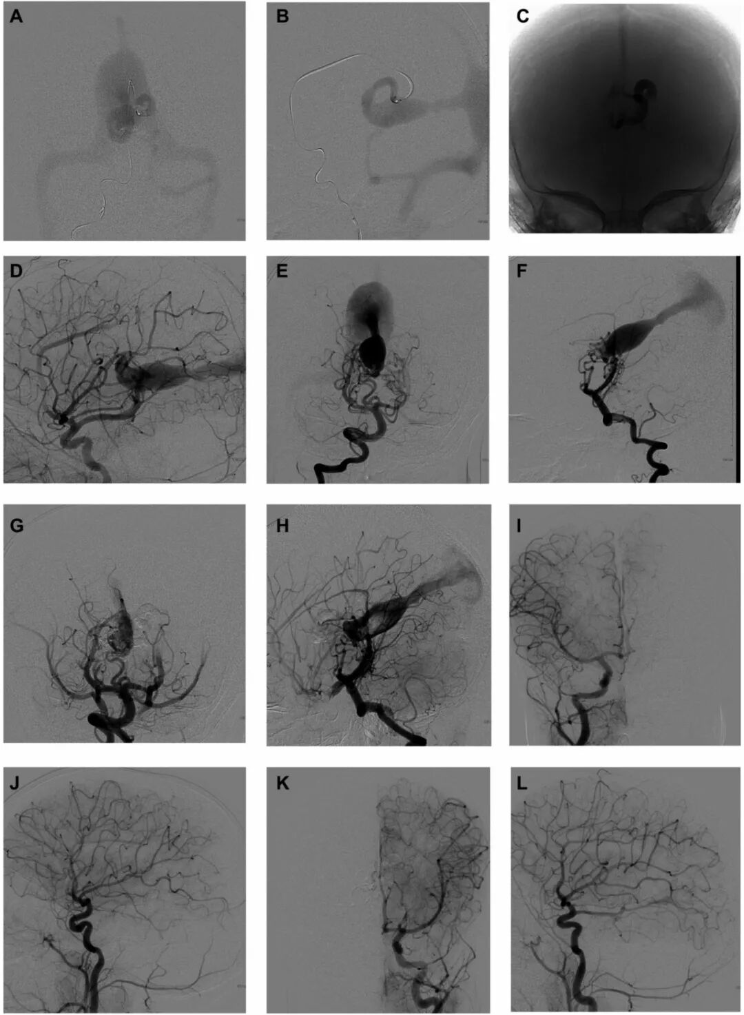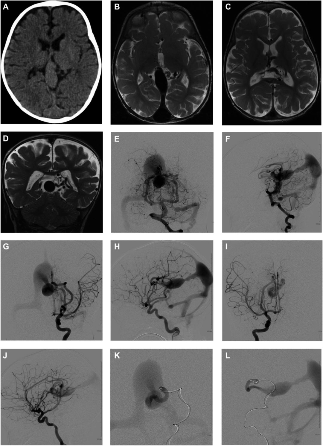 图2 足月患儿,表现为面部静脉扩张、大头畸形、发育迟缓,A-D 患儿10月龄时诊断为VGAM,头颅CT及核磁提示Galen静脉及供血动脉扩张,E-F 左椎动脉造影显示双侧脉络膜后外侧动脉供血,G-H 左侧颈内动脉造影显示脉络膜前动脉供血,静脉期表现为镰状窦狭窄和两侧颈静脉球发育不良,I-J 右侧颈内动脉造影显示大脑前动脉额外供血,向扩张的前脑正中静脉引流K-L 脉络膜前动脉超选造影显示扩张的供血动脉及瘘口。