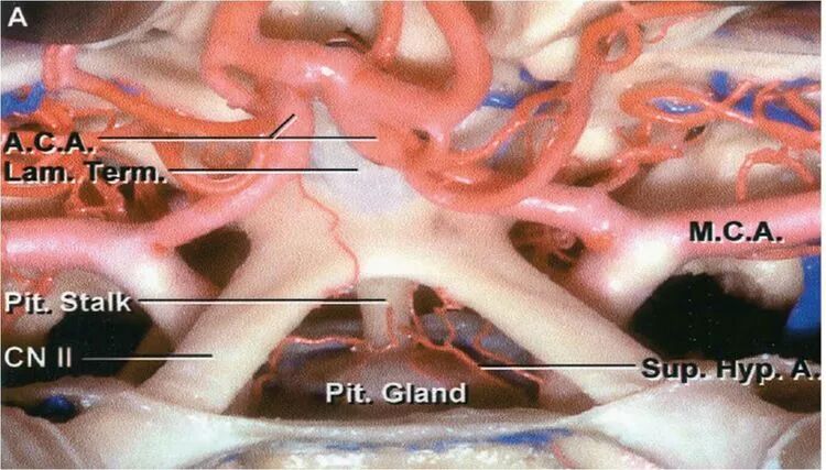 大脑镰,有时移位;垂体柄,有时被肿瘤推挤至侧后方,无法观察;终板上方的前交通动脉,常有变异、扭曲、移位。病理状态下,这些既往学习的正常尸头之中线结构,在临床手术实践中,却常常派不上用场。