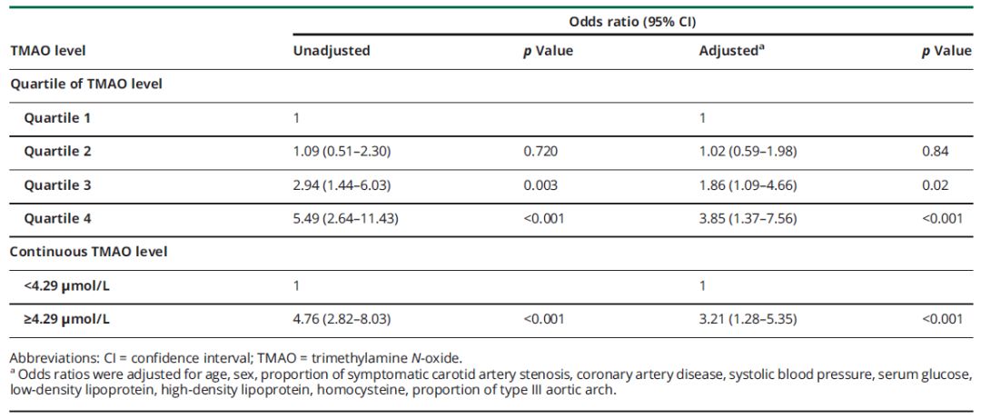 268例患者中,117例(43.7%)在CAS术后的磁共振扩散加权成像(MRI-DWI)上发现新发缺血性脑损伤病灶。这些患者的血浆TMAO水平高于无新发缺血性脑损伤者(中位数5.2μmol/L比3.2μmol/L;P<0.001);表明血浆TMAO水平升高与CAS术后在MRI-DWI上出现新病变的风险相关(表1)。