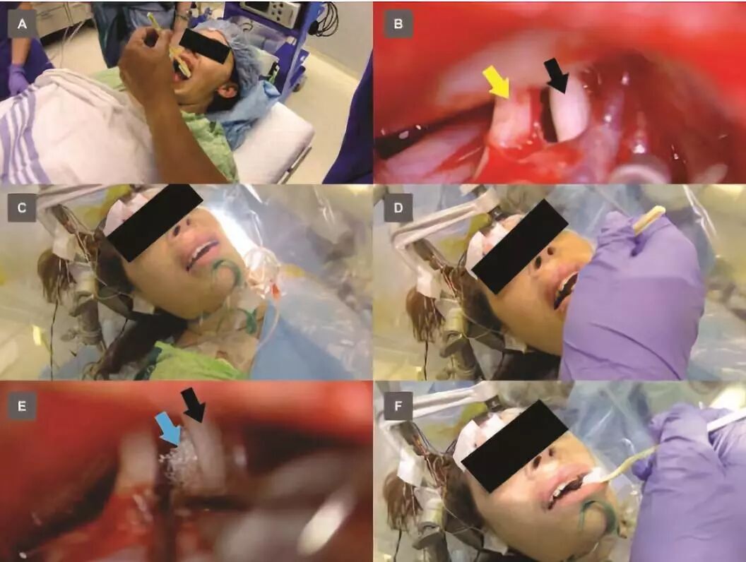 图1. A.患者取平卧位,使用特定的触发器(如牙刷)诱发面部疼痛;B.术中暴露三叉神经(黑色箭头),其下方为面--听神经复合体(黄色箭头);C.三叉神经暴露后,停止输注镇静药物,使患者处于完全清醒状态;D.使用触发器诱发面部疼痛;E.术中使用Teflon(蓝色箭头)垫于三叉神经根进桥脑区(黑色箭头);F.用触发器诱发面部疼痛,如疼痛消失表明减压手术成功。