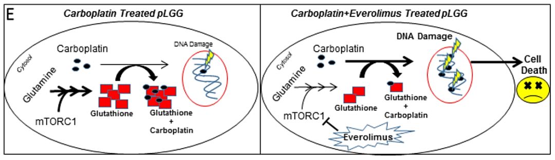 研究人员应用卡铂与依维莫司处理4种pLGG细胞株和1例来源于患者的原代pLGG细胞。5类肿瘤细胞均存在活化的mTOR信号通路,并包含多种pLGG基因类型,如NF1缺失、BRAF-KIAA1549基因融合和BRAFV600E突变等。检测药物处理后肿瘤细胞的生长、增殖和死亡状况。结果显示,在4种pLGG细胞株中,卡铂与依维莫司在抑制增殖方面具有协同作用(Fa=0.5时,药物组合指数<1)。与单独使用任何一种药物相比,联合治疗可促进肿瘤细胞凋亡。体外实验进一步证实依维莫司抑制mTORC1,降低细胞内谷胱甘肽的含量,而明显升高γ-H2AX磷酸化水平,显示依维莫司有助于卡铂对DNA双链的损伤作用,二者可产生化疗协同作用(图1)。同时,体内实验表明,联合治疗对抑制荷瘤小鼠体内肿瘤生长具有显著的优势。