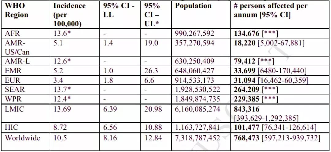 表1. 世界范围内和WHO分区显示TSI发病率。