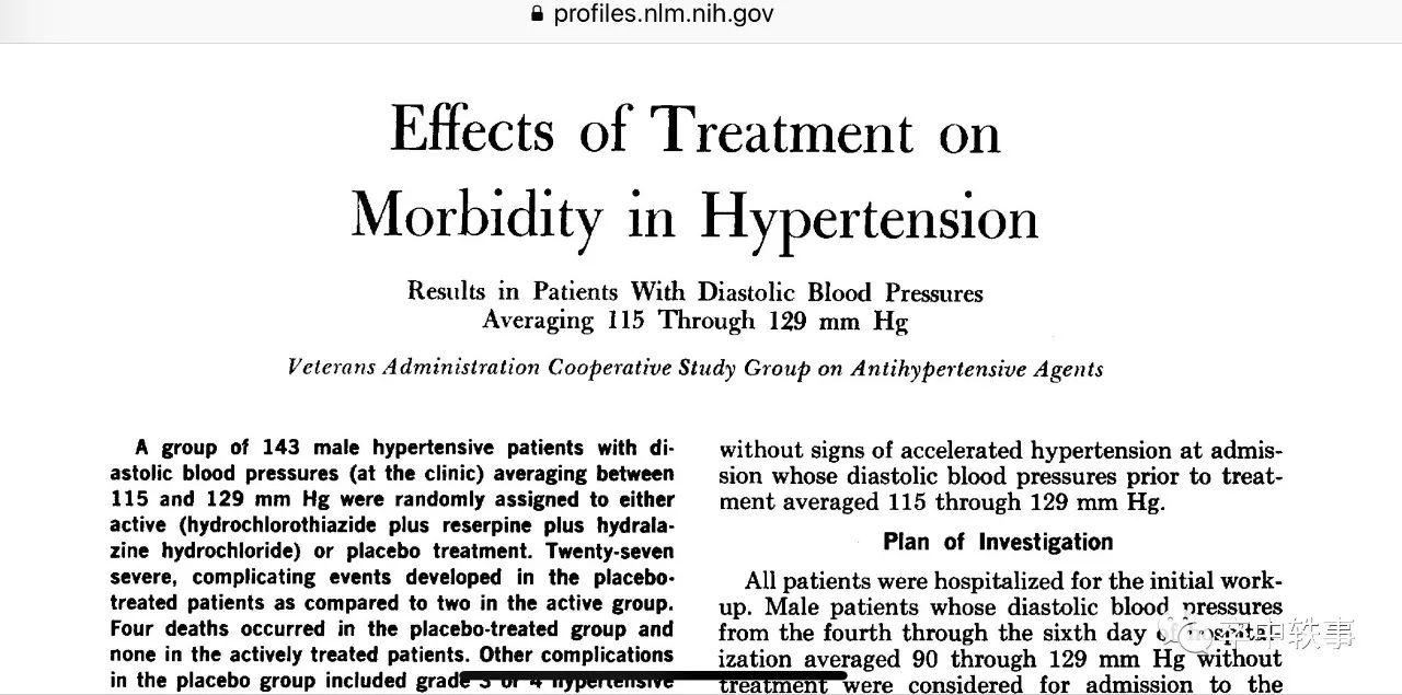 这是美国的一项有对照组的研究,被称为 “退伍军人高血压治疗研究 - Veterans Administration Cooperation Study Group on Antihypertensive Agents”,主要由 Edward Freis 指挥的。