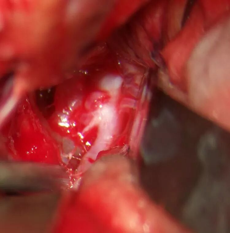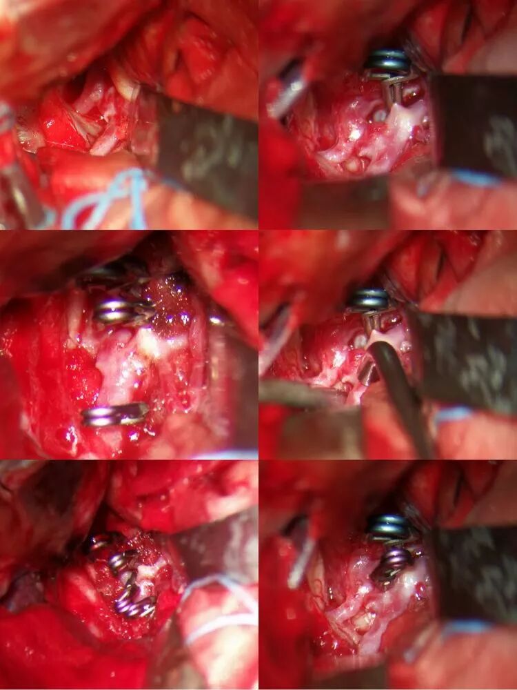 暴露颈内动脉、大脑前动脉A1以备临时阻断,脑板轻轻牵拉直回,解剖纵裂底部蛛网膜,轻松暴露同侧A2、前交通动脉、对侧A2、对侧A1及动脉瘤体,发现大动脉瘤位于前交通复合体背侧,瘤颈被同侧A1遮挡,瘤体被双侧A2和前交通动脉遮挡,前交通动脉前方又有一个小动脉瘤,同侧A2近端有4根穿支(包括返支)动脉,跨血管夹使用有困难,也担心前交通复合体丘脑穿支误夹,决定用长弯夹先夹闭可见动脉瘤颈,之后再以mini直角弯夹补充夹闭瘤颈,之后升血压过程中有异常出血,探查发现瘤颈依然有残留,在同侧A1外侧再补夹残留瘤颈,出血停止。前交通复合体前方小动脉瘤顺利夹闭。术中显微超声探查双侧A2血流回声正常,打开终板池,硬膜常规缝合。
