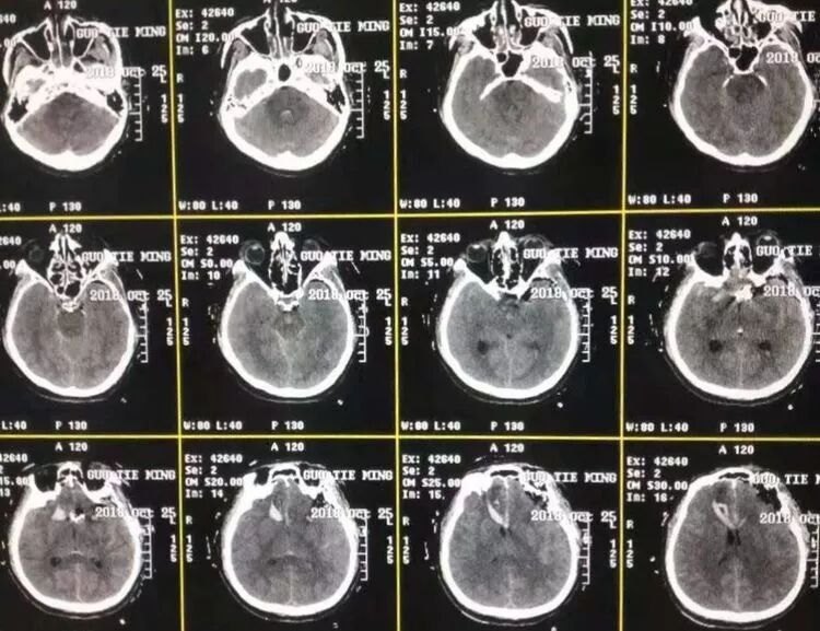 术后病人神志清,肢体活动自如,术后每小时尿量正常,尿比重正常,复查头CT满意(图9)。但术侧眼睑略有青紫。