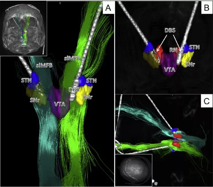 作者通过对24例患者共144侧的微电极轨迹分析发现,有效触点在白质纤维内,而不是周围的灰质核团中;推测电刺激直接调控slMFB达到治疗抑郁症的效果。slMFB-DBS作用机制可能是产生顺行和逆行轴突刺激,作用于前额叶皮质和腹侧被盖区,实现脑网络调控。而slMFB-DBS必须由纤维束示踪辅助才能更好地实施。